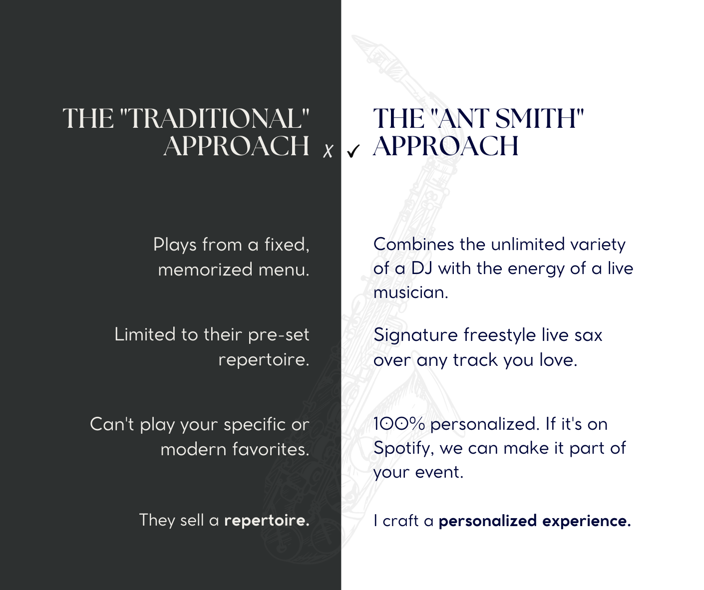 “Ant absolutely killed it at our wedding, he ripped it on the saxophone for HOURS. His ability to adapt to the DJs music and versatility with the crowd is extremely impressive. Not only is he an amazing musician, he’s a genuinely nice guy and wonderful to work with. Very flexible with timing the performance to when we needed him, just an overall amazing addition to a wonderful night. Thanks again for making the night amazing!”